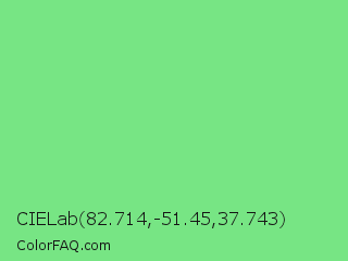 CIELab 82.714,-51.45,37.743 Color is a light green color and the nearest color is Pastel Green #77dd77. Hex code #77e584 and RGB value is rgb(119,229,132). In RGB color space, this color is composed of 47% red, 90% green, 52% blue, In CMYK color space, this color is composed of 48% cyan, 0% magenta, 42% yellow , 10% black , In HSL color space, this color has a hue angle of 127° , 68% saturation and 68% lightness.