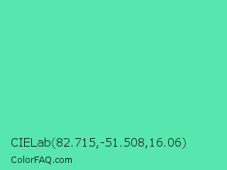 CIELab 82.715,-51.508,16.06 Color is a light green color and the nearest color is Medium Aquamarine #66ddaa. Hex code #56e6ae and RGB value is rgb(86,230,174). In RGB color space, this color is composed of 34% red, 90% green, 68% blue, In CMYK color space, this color is composed of 63% cyan, 0% magenta, 24% yellow , 10% black , In HSL color space, this color has a hue angle of 157° , 74% saturation and 62% lightness.