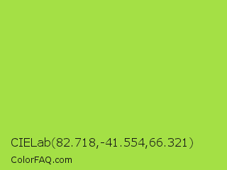 CIELab 82.718,-41.554,66.321 Color is a normal green color and the nearest color is Conifer #acdd4d. Hex code #a4e045 and RGB value is rgb(164,224,69). In RGB color space, this color is composed of 64% red, 88% green, 27% blue, In CMYK color space, this color is composed of 27% cyan, 0% magenta, 69% yellow , 12% black , In HSL color space, this color has a hue angle of 83° , 71% saturation and 57% lightness.
