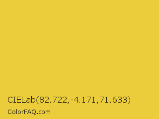 CIELab 82.722,-4.171,71.633 Color is a normal yellow color and the nearest color is Sandstorm #ecd540. Hex code #ebcd3b and RGB value is rgb(235,205,59). In RGB color space, this color is composed of 92% red, 80% green, 23% blue, In CMYK color space, this color is composed of 0% cyan, 13% magenta, 75% yellow , 8% black , In HSL color space, this color has a hue angle of 50° , 81% saturation and 58% lightness.