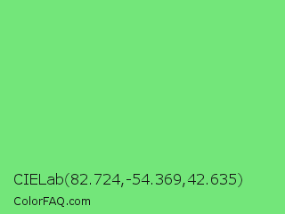 CIELab 82.724,-54.369,42.635 Color is a light green color and the nearest color is Pastel Green #77dd77. Hex code #73e67a and RGB value is rgb(115,230,122). In RGB color space, this color is composed of 45% red, 90% green, 48% blue, In CMYK color space, this color is composed of 50% cyan, 0% magenta, 47% yellow , 10% black , In HSL color space, this color has a hue angle of 124° , 70% saturation and 68% lightness.