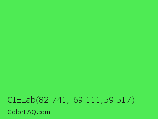 CIELab 82.741,-69.111,59.517 Color is a light green color and the nearest color is Screamin Green #66ff66. Hex code #4eeb54 and RGB value is rgb(78,235,84). In RGB color space, this color is composed of 31% red, 92% green, 33% blue, In CMYK color space, this color is composed of 67% cyan, 0% magenta, 64% yellow , 8% black , In HSL color space, this color has a hue angle of 122° , 80% saturation and 61% lightness.