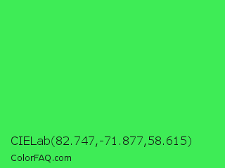 CIELab 82.747,-71.877,58.615 Color is a normal green color and the nearest color is UFO Green #3cd070. Hex code #3eec56 and RGB value is rgb(62,236,86). In RGB color space, this color is composed of 24% red, 93% green, 34% blue, In CMYK color space, this color is composed of 74% cyan, 0% magenta, 64% yellow , 7% black , In HSL color space, this color has a hue angle of 128° , 82% saturation and 58% lightness.