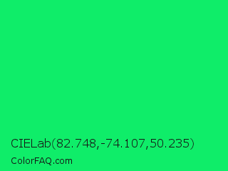 CIELab 82.748,-74.107,50.235 Color is a normal green color and the nearest color is Malachite #0bda51. Hex code #0fed69 and RGB value is rgb(15,237,105). In RGB color space, this color is composed of 6% red, 93% green, 41% blue, In CMYK color space, this color is composed of 94% cyan, 0% magenta, 56% yellow , 7% black , In HSL color space, this color has a hue angle of 144° , 88% saturation and 49% lightness.