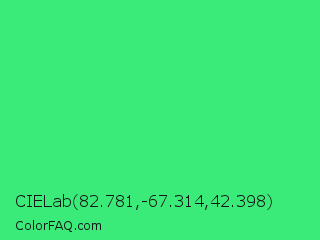 CIELab 82.781,-67.314,42.398 Color is a normal green color and the nearest color is UFO Green #3cd070. Hex code #3beb7a and RGB value is rgb(59,235,122). In RGB color space, this color is composed of 23% red, 92% green, 48% blue, In CMYK color space, this color is composed of 75% cyan, 0% magenta, 48% yellow , 8% black , In HSL color space, this color has a hue angle of 141° , 81% saturation and 58% lightness.