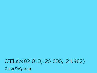 CIELab 82.813,-26.036,-24.982 Color is a light cyan color and the nearest color is Turquoise Blue #6cdae7. Hex code #61defc and RGB value is rgb(97,222,252). In RGB color space, this color is composed of 38% red, 87% green, 99% blue, In CMYK color space, this color is composed of 62% cyan, 12% magenta, 0% yellow , 1% black , In HSL color space, this color has a hue angle of 192° , 96% saturation and 68% lightness.
