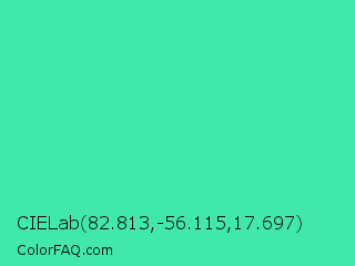 CIELab 82.813,-56.115,17.697 Color is a normal green color and the nearest color is Eucalyptus #44d7a8. Hex code #42e8ab and RGB value is rgb(66,232,171). In RGB color space, this color is composed of 26% red, 91% green, 67% blue, In CMYK color space, this color is composed of 72% cyan, 0% magenta, 26% yellow , 9% black , In HSL color space, this color has a hue angle of 158° , 78% saturation and 58% lightness.