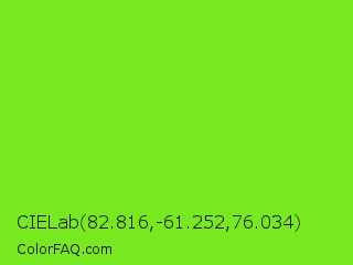 CIELab 82.816,-61.252,76.034 Color is a normal green color and the nearest color is Spring Frost #87ff2a. Hex code #78e821 and RGB value is rgb(120,232,33). In RGB color space, this color is composed of 47% red, 91% green, 13% blue, In CMYK color space, this color is composed of 48% cyan, 0% magenta, 86% yellow , 9% black , In HSL color space, this color has a hue angle of 94° , 81% saturation and 52% lightness.