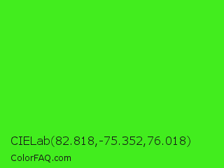 CIELab 82.818,-75.352,76.018 Color is a normal green color and the nearest color is Neon Green #39ff14. Hex code #42ed1e and RGB value is rgb(66,237,30). In RGB color space, this color is composed of 26% red, 93% green, 12% blue, In CMYK color space, this color is composed of 72% cyan, 0% magenta, 87% yellow , 7% black , In HSL color space, this color has a hue angle of 110° , 85% saturation and 52% lightness.
