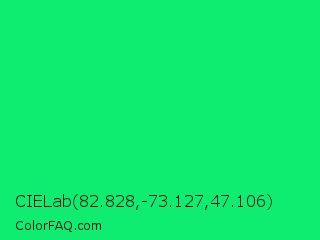 CIELab 82.828,-73.127,47.106 Color is a normal green color and the nearest color is Spring Green #00ff7f. Hex code #0fed70 and RGB value is rgb(15,237,112). In RGB color space, this color is composed of 6% red, 93% green, 44% blue, In CMYK color space, this color is composed of 94% cyan, 0% magenta, 53% yellow , 7% black , In HSL color space, this color has a hue angle of 146° , 88% saturation and 49% lightness.