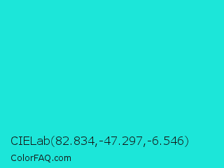 CIELab 82.834,-47.297,-6.546 Color is a normal cyan color and the nearest color is Bright Turquoise #08e8de. Hex code #1ce6d9 and RGB value is rgb(28,230,217). In RGB color space, this color is composed of 11% red, 90% green, 85% blue, In CMYK color space, this color is composed of 88% cyan, 0% magenta, 6% yellow , 10% black , In HSL color space, this color has a hue angle of 176° , 80% saturation and 51% lightness.