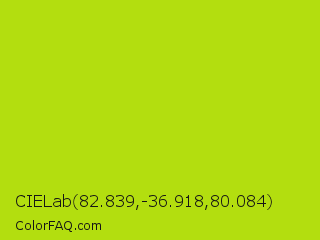 CIELab 82.839,-36.918,80.084 Color is a normal lime color and the nearest color is Inch Worm #b0e313. Hex code #b3de0f and RGB value is rgb(179,222,15). In RGB color space, this color is composed of 70% red, 87% green, 6% blue, In CMYK color space, this color is composed of 19% cyan, 0% magenta, 93% yellow , 13% black , In HSL color space, this color has a hue angle of 72° , 87% saturation and 46% lightness.