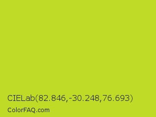 CIELab 82.846,-30.248,76.693 Color is a normal yellow color and the nearest color is Key Lime Pie #bfc921. Hex code #bfdb25 and RGB value is rgb(191,219,37). In RGB color space, this color is composed of 75% red, 86% green, 15% blue, In CMYK color space, this color is composed of 13% cyan, 0% magenta, 83% yellow , 14% black , In HSL color space, this color has a hue angle of 69° , 72% saturation and 50% lightness.