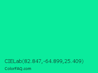 CIELab 82.847,-64.899,25.409 Color is a normal green color and the nearest color is Medium Spring Green #00fa9a. Hex code #09eb9c and RGB value is rgb(9,235,156). In RGB color space, this color is composed of 4% red, 92% green, 61% blue, In CMYK color space, this color is composed of 96% cyan, 0% magenta, 34% yellow , 8% black , In HSL color space, this color has a hue angle of 159° , 93% saturation and 48% lightness.
