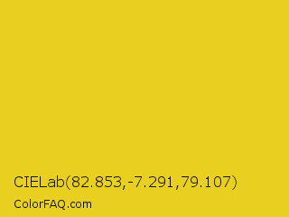 CIELab 82.853,-7.291,79.107 Color is a normal yellow color and the nearest color is Sunflower #e4d422. Hex code #e8cf20 and RGB value is rgb(232,207,32). In RGB color space, this color is composed of 91% red, 81% green, 13% blue, In CMYK color space, this color is composed of 0% cyan, 11% magenta, 86% yellow , 9% black , In HSL color space, this color has a hue angle of 53° , 81% saturation and 52% lightness.