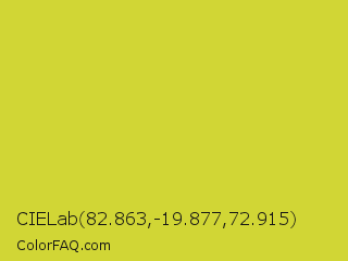 CIELab 82.863,-19.877,72.915 Color is a normal yellow color and the nearest color is Pear #d1e231. Hex code #d1d635 and RGB value is rgb(209,214,53). In RGB color space, this color is composed of 82% red, 84% green, 21% blue, In CMYK color space, this color is composed of 2% cyan, 0% magenta, 75% yellow , 16% black , In HSL color space, this color has a hue angle of 62° , 66% saturation and 52% lightness.