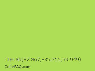 CIELab 82.867,-35.715,59.949 Color is a normal green color and the nearest color is Conifer #acdd4d. Hex code #aede56 and RGB value is rgb(174,222,86). In RGB color space, this color is composed of 68% red, 87% green, 34% blue, In CMYK color space, this color is composed of 22% cyan, 0% magenta, 61% yellow , 13% black , In HSL color space, this color has a hue angle of 81° , 67% saturation and 60% lightness.