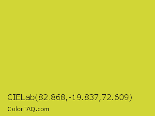CIELab 82.868,-19.837,72.609 Color is a normal yellow color and the nearest color is Pear #d1e231. Hex code #d1d636 and RGB value is rgb(209,214,54). In RGB color space, this color is composed of 82% red, 84% green, 21% blue, In CMYK color space, this color is composed of 2% cyan, 0% magenta, 75% yellow , 16% black , In HSL color space, this color has a hue angle of 62° , 66% saturation and 53% lightness.