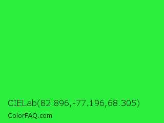 CIELab 82.896,-77.196,68.305 Color is a normal green color and the nearest color is Lime Green #32cd32. Hex code #2aee3c and RGB value is rgb(42,238,60). In RGB color space, this color is composed of 16% red, 93% green, 24% blue, In CMYK color space, this color is composed of 82% cyan, 0% magenta, 75% yellow , 7% black , In HSL color space, this color has a hue angle of 126° , 85% saturation and 55% lightness.