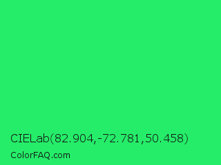 CIELab 82.904,-72.781,50.458 Color is a normal green color and the nearest color is UFO Green #3cd070. Hex code #25ed69 and RGB value is rgb(37,237,105). In RGB color space, this color is composed of 15% red, 93% green, 41% blue, In CMYK color space, this color is composed of 84% cyan, 0% magenta, 56% yellow , 7% black , In HSL color space, this color has a hue angle of 140° , 85% saturation and 54% lightness.