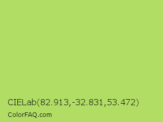 CIELab 82.913,-32.831,53.472 Color is a light green color and the nearest color is Inchworm #b2ec5d. Hex code #b1dd65 and RGB value is rgb(177,221,101). In RGB color space, this color is composed of 69% red, 87% green, 40% blue, In CMYK color space, this color is composed of 20% cyan, 0% magenta, 54% yellow , 13% black , In HSL color space, this color has a hue angle of 82° , 64% saturation and 63% lightness.