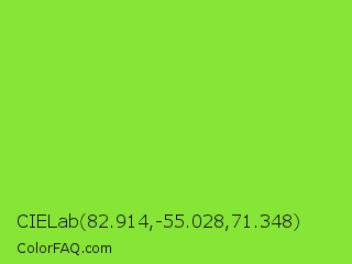 CIELab 82.914,-55.028,71.348 Color is a normal green color and the nearest color is Kiwi #8ee53f. Hex code #87e635 and RGB value is rgb(135,230,53). In RGB color space, this color is composed of 53% red, 90% green, 21% blue, In CMYK color space, this color is composed of 41% cyan, 0% magenta, 77% yellow , 10% black , In HSL color space, this color has a hue angle of 92° , 78% saturation and 55% lightness.