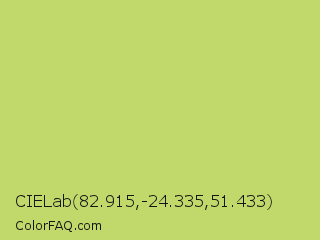 CIELab 82.915,-24.335,51.433 Color is a light lime color and the nearest color is Yellow Green #c5e17a. Hex code #c1d96a and RGB value is rgb(193,217,106). In RGB color space, this color is composed of 76% red, 85% green, 42% blue, In CMYK color space, this color is composed of 11% cyan, 0% magenta, 51% yellow , 15% black , In HSL color space, this color has a hue angle of 73° , 59% saturation and 63% lightness.