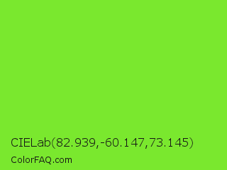 CIELab 82.939,-60.147,73.145 Color is a normal green color and the nearest color is Kiwi #8ee53f. Hex code #7ae82e and RGB value is rgb(122,232,46). In RGB color space, this color is composed of 48% red, 91% green, 18% blue, In CMYK color space, this color is composed of 47% cyan, 0% magenta, 80% yellow , 9% black , In HSL color space, this color has a hue angle of 95° , 80% saturation and 55% lightness.