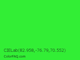 CIELab 82.958,-76.79,70.552 Color is a normal green color and the nearest color is Lime Green #32cd32. Hex code #32ee35 and RGB value is rgb(50,238,53). In RGB color space, this color is composed of 20% red, 93% green, 21% blue, In CMYK color space, this color is composed of 79% cyan, 0% magenta, 78% yellow , 7% black , In HSL color space, this color has a hue angle of 121° , 85% saturation and 56% lightness.