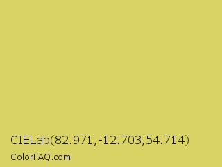 CIELab 82.971,-12.703,54.714 Color is a light yellow color and the nearest color is Tacha #d6c562. Hex code #d8d364 and RGB value is rgb(216,211,100). In RGB color space, this color is composed of 85% red, 83% green, 39% blue, In CMYK color space, this color is composed of 0% cyan, 2% magenta, 54% yellow , 15% black , In HSL color space, this color has a hue angle of 57° , 60% saturation and 62% lightness.