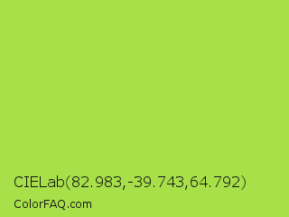 CIELab 82.983,-39.743,64.792 Color is a normal green color and the nearest color is Conifer #acdd4d. Hex code #a8e04a and RGB value is rgb(168,224,74). In RGB color space, this color is composed of 66% red, 88% green, 29% blue, In CMYK color space, this color is composed of 25% cyan, 0% magenta, 67% yellow , 12% black , In HSL color space, this color has a hue angle of 82° , 71% saturation and 58% lightness.