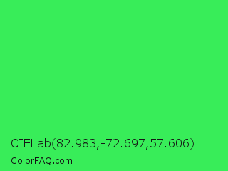 CIELab 82.983,-72.697,57.606 Color is a normal green color and the nearest color is UFO Green #3cd070. Hex code #38ed59 and RGB value is rgb(56,237,89). In RGB color space, this color is composed of 22% red, 93% green, 35% blue, In CMYK color space, this color is composed of 76% cyan, 0% magenta, 62% yellow , 7% black , In HSL color space, this color has a hue angle of 131° , 83% saturation and 57% lightness.