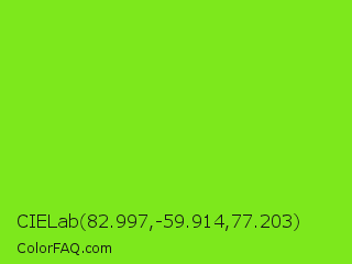 CIELab 82.997,-59.914,77.203 Color is a normal green color and the nearest color is Spring Frost #87ff2a. Hex code #7de81c and RGB value is rgb(125,232,28). In RGB color space, this color is composed of 49% red, 91% green, 11% blue, In CMYK color space, this color is composed of 46% cyan, 0% magenta, 88% yellow , 9% black , In HSL color space, this color has a hue angle of 91° , 82% saturation and 51% lightness.
