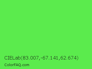 CIELab 83.007,-67.141,62.674 Color is a light green color and the nearest color is Screamin Green #66ff66. Hex code #5beb4d and RGB value is rgb(91,235,77). In RGB color space, this color is composed of 36% red, 92% green, 30% blue, In CMYK color space, this color is composed of 61% cyan, 0% magenta, 67% yellow , 8% black , In HSL color space, this color has a hue angle of 115° , 80% saturation and 61% lightness.