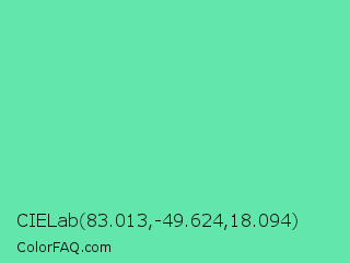 CIELab 83.013,-49.624,18.094 Color is a light green color and the nearest color is Medium Aquamarine #66ddaa. Hex code #63e6ab and RGB value is rgb(99,230,171). In RGB color space, this color is composed of 39% red, 90% green, 67% blue, In CMYK color space, this color is composed of 57% cyan, 0% magenta, 26% yellow , 10% black , In HSL color space, this color has a hue angle of 153° , 72% saturation and 65% lightness.