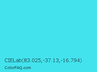 CIELab 83.025,-37.13,-16.794 Color is a normal cyan color and the nearest color is Turquoise #40e0d0. Hex code #42e3ed and RGB value is rgb(66,227,237). In RGB color space, this color is composed of 26% red, 89% green, 93% blue, In CMYK color space, this color is composed of 72% cyan, 4% magenta, 0% yellow , 7% black , In HSL color space, this color has a hue angle of 184° , 83% saturation and 59% lightness.