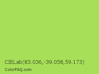 CIELab 83.036,-39.058,59.173 Color is a light green color and the nearest color is Conifer #acdd4d. Hex code #a7e058 and RGB value is rgb(167,224,88). In RGB color space, this color is composed of 65% red, 88% green, 35% blue, In CMYK color space, this color is composed of 25% cyan, 0% magenta, 61% yellow , 12% black , In HSL color space, this color has a hue angle of 85° , 69% saturation and 61% lightness.