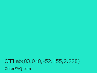 CIELab 83.048,-52.155,2.228 Color is a normal cyan color and the nearest color is Turquoise PWG #30d5c8. Hex code #21e8c9 and RGB value is rgb(33,232,201). In RGB color space, this color is composed of 13% red, 91% green, 79% blue, In CMYK color space, this color is composed of 86% cyan, 0% magenta, 13% yellow , 9% black , In HSL color space, this color has a hue angle of 171° , 81% saturation and 52% lightness.