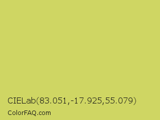 CIELab 83.051,-17.925,55.079 Color is a light yellow color and the nearest color is Tacha #d6c562. Hex code #cfd663 and RGB value is rgb(207,214,99). In RGB color space, this color is composed of 81% red, 84% green, 39% blue, In CMYK color space, this color is composed of 3% cyan, 0% magenta, 54% yellow , 16% black , In HSL color space, this color has a hue angle of 64° , 58% saturation and 61% lightness.