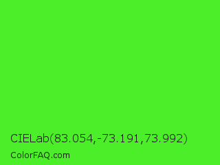 CIELab 83.054,-73.191,73.992 Color is a normal green color and the nearest color is Neon Green #39ff14. Hex code #4ced29 and RGB value is rgb(76,237,41). In RGB color space, this color is composed of 30% red, 93% green, 16% blue, In CMYK color space, this color is composed of 68% cyan, 0% magenta, 83% yellow , 7% black , In HSL color space, this color has a hue angle of 109° , 84% saturation and 55% lightness.