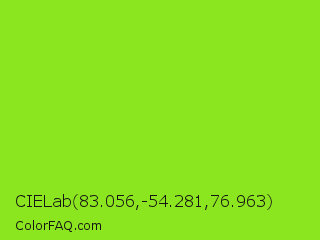 CIELab 83.056,-54.281,76.963 Color is a normal green color and the nearest color is Spring Frost #87ff2a. Hex code #8ce61f and RGB value is rgb(140,230,31). In RGB color space, this color is composed of 55% red, 90% green, 12% blue, In CMYK color space, this color is composed of 39% cyan, 0% magenta, 87% yellow , 10% black , In HSL color space, this color has a hue angle of 87° , 80% saturation and 51% lightness.