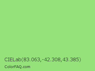 CIELab 83.063,-42.308,43.385 Color is a light green color and the nearest color is Feijoa #9fdd8c. Hex code #96e27a and RGB value is rgb(150,226,122). In RGB color space, this color is composed of 59% red, 89% green, 48% blue, In CMYK color space, this color is composed of 34% cyan, 0% magenta, 46% yellow , 11% black , In HSL color space, this color has a hue angle of 104° , 64% saturation and 68% lightness.