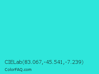 CIELab 83.067,-45.541,-7.239 Color is a normal cyan color and the nearest color is Turquoise #40e0d0. Hex code #2ee6db and RGB value is rgb(46,230,219). In RGB color space, this color is composed of 18% red, 90% green, 86% blue, In CMYK color space, this color is composed of 80% cyan, 0% magenta, 5% yellow , 10% black , In HSL color space, this color has a hue angle of 176° , 79% saturation and 54% lightness.