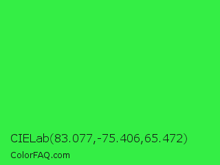 CIELab 83.077,-75.406,65.472 Color is a normal green color and the nearest color is Lime Green #32cd32. Hex code #34ee45 and RGB value is rgb(52,238,69). In RGB color space, this color is composed of 20% red, 93% green, 27% blue, In CMYK color space, this color is composed of 78% cyan, 0% magenta, 71% yellow , 7% black , In HSL color space, this color has a hue angle of 125° , 85% saturation and 57% lightness.