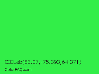 CIELab 83.07,-75.393,64.371 Color is a normal green color and the nearest color is Lime Green #32cd32. Hex code #32ee48 and RGB value is rgb(50,238,72). In RGB color space, this color is composed of 20% red, 93% green, 28% blue, In CMYK color space, this color is composed of 79% cyan, 0% magenta, 70% yellow , 7% black , In HSL color space, this color has a hue angle of 127° , 85% saturation and 56% lightness.