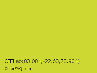 CIELab 83.084,-22.63,73.904 Color is a normal yellow color and the nearest color is Pear #d1e231. Hex code #cdd832 and RGB value is rgb(205,216,50). In RGB color space, this color is composed of 80% red, 85% green, 20% blue, In CMYK color space, this color is composed of 5% cyan, 0% magenta, 77% yellow , 15% black , In HSL color space, this color has a hue angle of 64° , 68% saturation and 52% lightness.