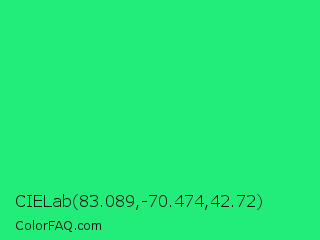 CIELab 83.089,-70.474,42.72 Color is a normal green color and the nearest color is UFO Green #3cd070. Hex code #23ed7a and RGB value is rgb(35,237,122). In RGB color space, this color is composed of 14% red, 93% green, 48% blue, In CMYK color space, this color is composed of 85% cyan, 0% magenta, 49% yellow , 7% black , In HSL color space, this color has a hue angle of 146° , 85% saturation and 53% lightness.