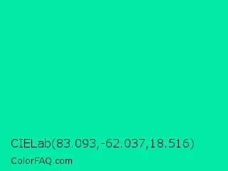 CIELab 83.093,-62.037,18.516 Color is a normal green color and the nearest color is Medium Spring Green #00fa9a. Hex code #03ebaa and RGB value is rgb(3,235,170). In RGB color space, this color is composed of 1% red, 92% green, 67% blue, In CMYK color space, this color is composed of 99% cyan, 0% magenta, 28% yellow , 8% black , In HSL color space, this color has a hue angle of 163° , 97% saturation and 47% lightness.