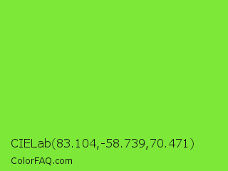 CIELab 83.104,-58.739,70.471 Color is a normal green color and the nearest color is Kiwi #8ee53f. Hex code #7de838 and RGB value is rgb(125,232,56). In RGB color space, this color is composed of 49% red, 91% green, 22% blue, In CMYK color space, this color is composed of 46% cyan, 0% magenta, 76% yellow , 9% black , In HSL color space, this color has a hue angle of 96° , 79% saturation and 56% lightness.