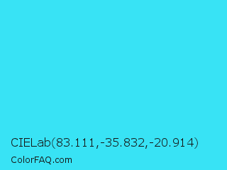 CIELab 83.111,-35.832,-20.914 Color is a normal cyan color and the nearest color is Turquoise #40e0d0. Hex code #38e3f5 and RGB value is rgb(56,227,245). In RGB color space, this color is composed of 22% red, 89% green, 96% blue, In CMYK color space, this color is composed of 77% cyan, 7% magenta, 0% yellow , 4% black , In HSL color space, this color has a hue angle of 186° , 90% saturation and 59% lightness.